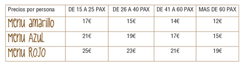 De 15 a 25 personas: 25 € | de 26 a 40 personas: 23 € | de 41 a 60 personas: 21 € | más de 60 personas: 19 €