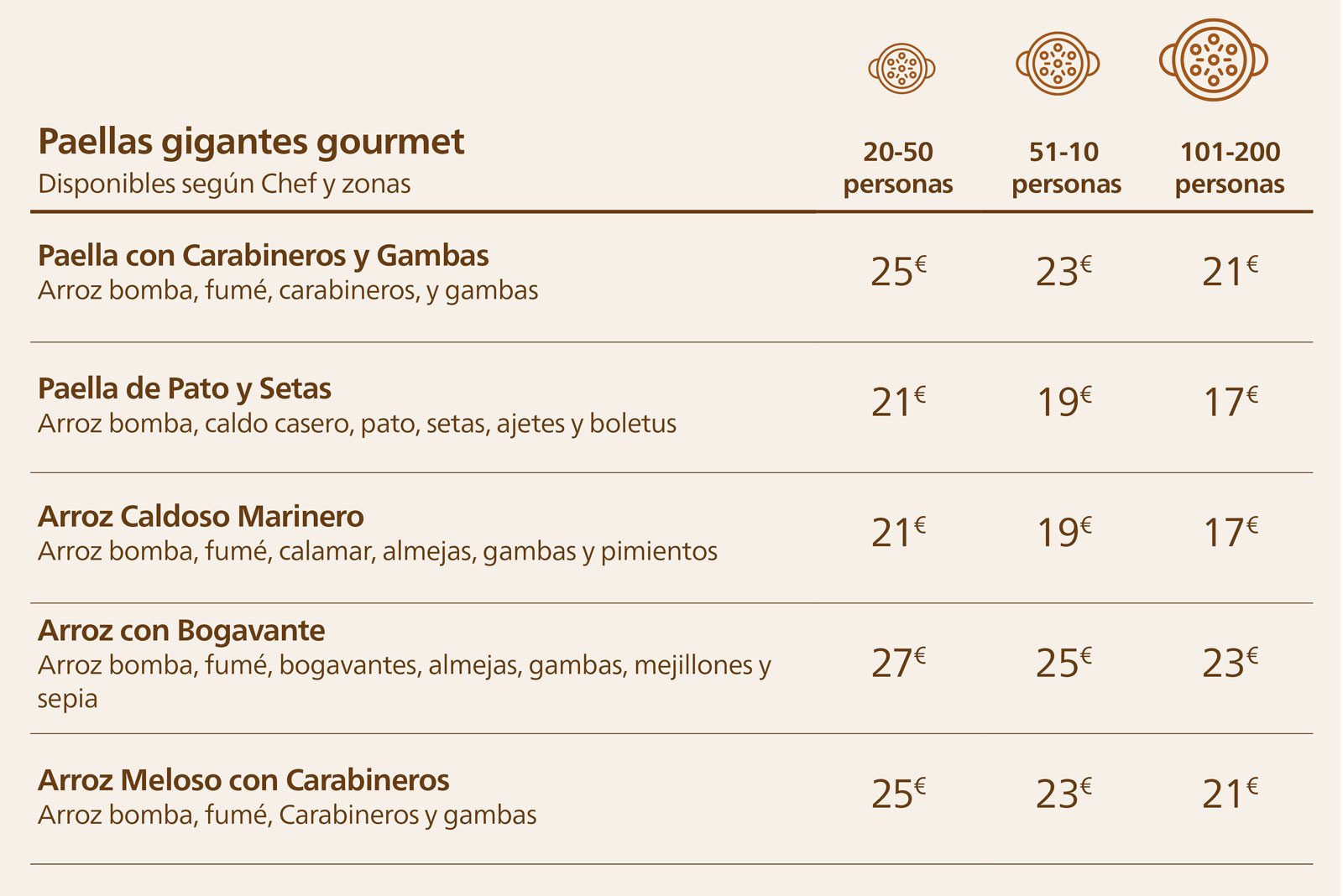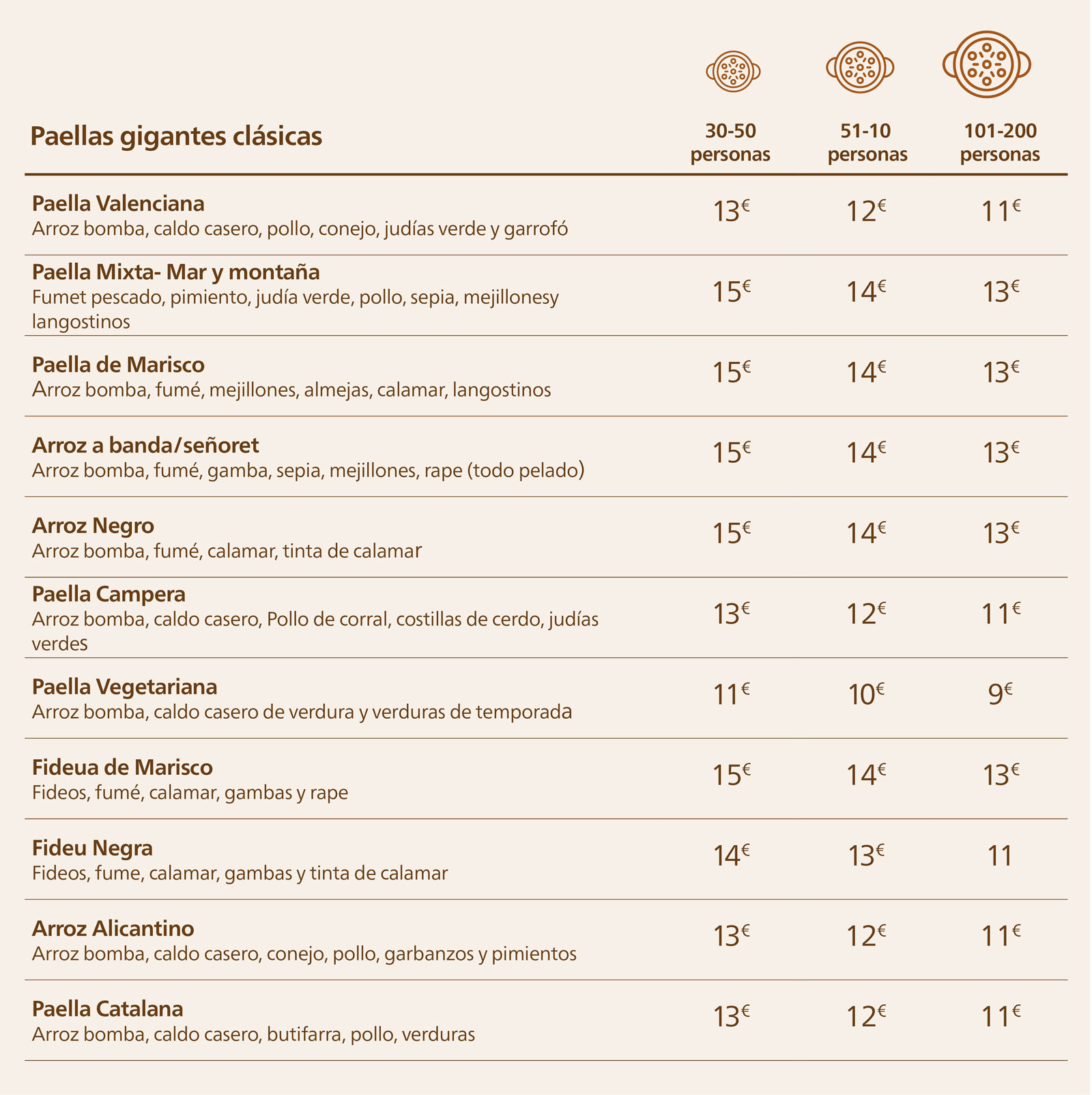 – 16 tipos de paellas a elegir. De 30 a 400 personas.